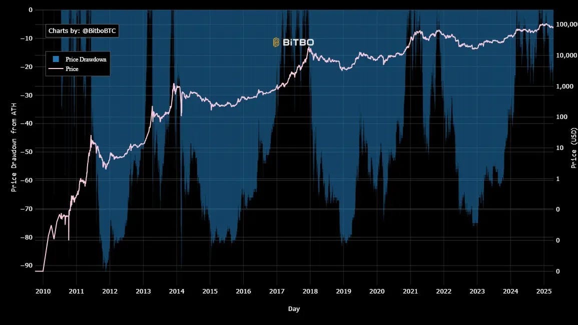 As charted by BitBo, you can see as illuminated in the blue how BTC drawdowns are commonplace and occur every cycle. 14.4.25